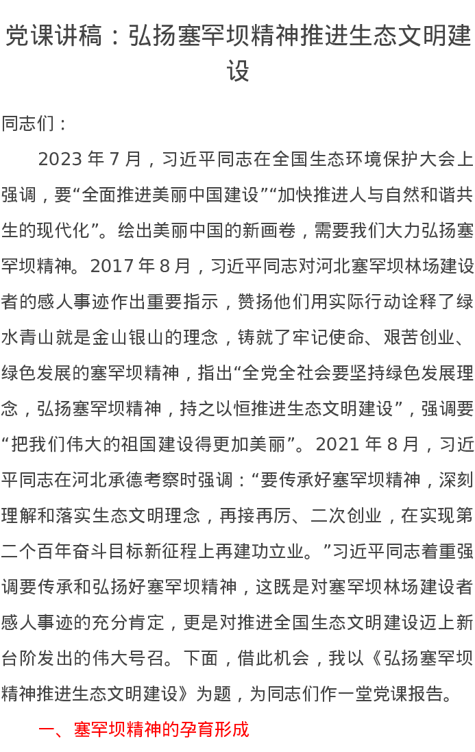党课讲稿:弘扬塞罕坝精神推进生态文明建设