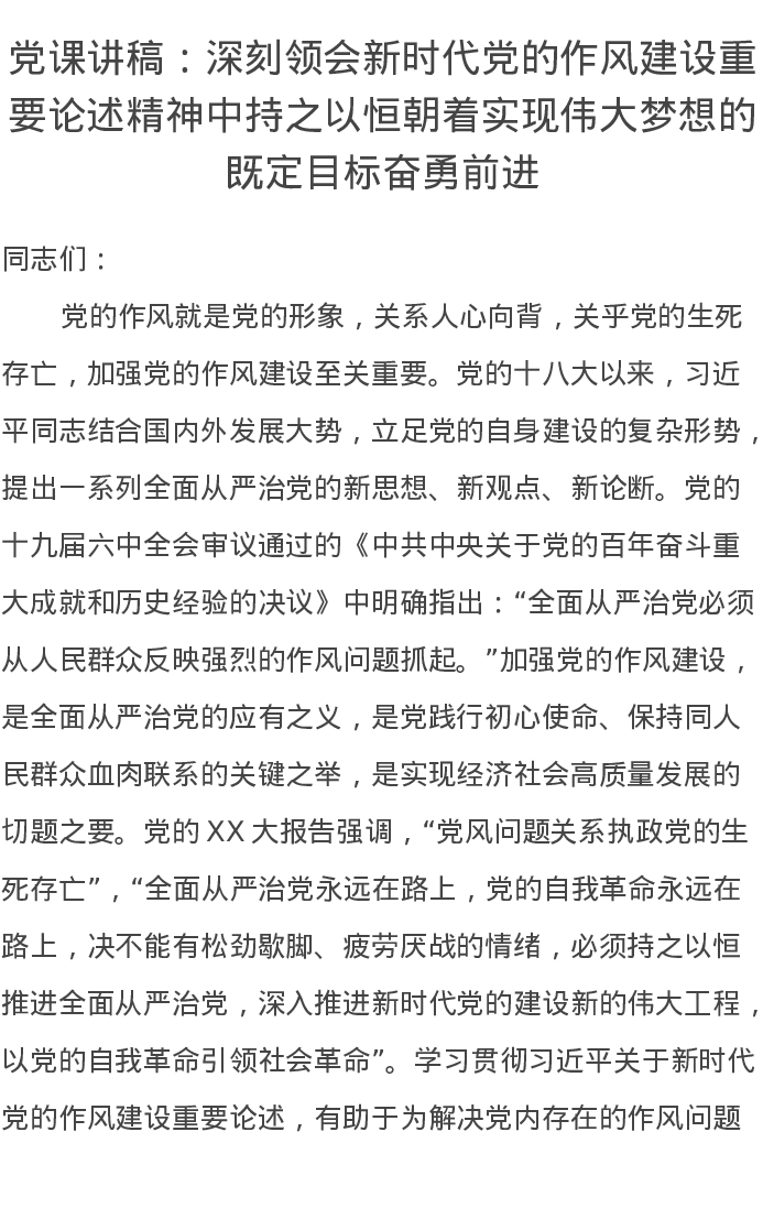 党课讲稿:深刻领会新时代党的作风建设重要论述精神中持之以恒朝着实现伟大梦想的既定目标奋勇前进