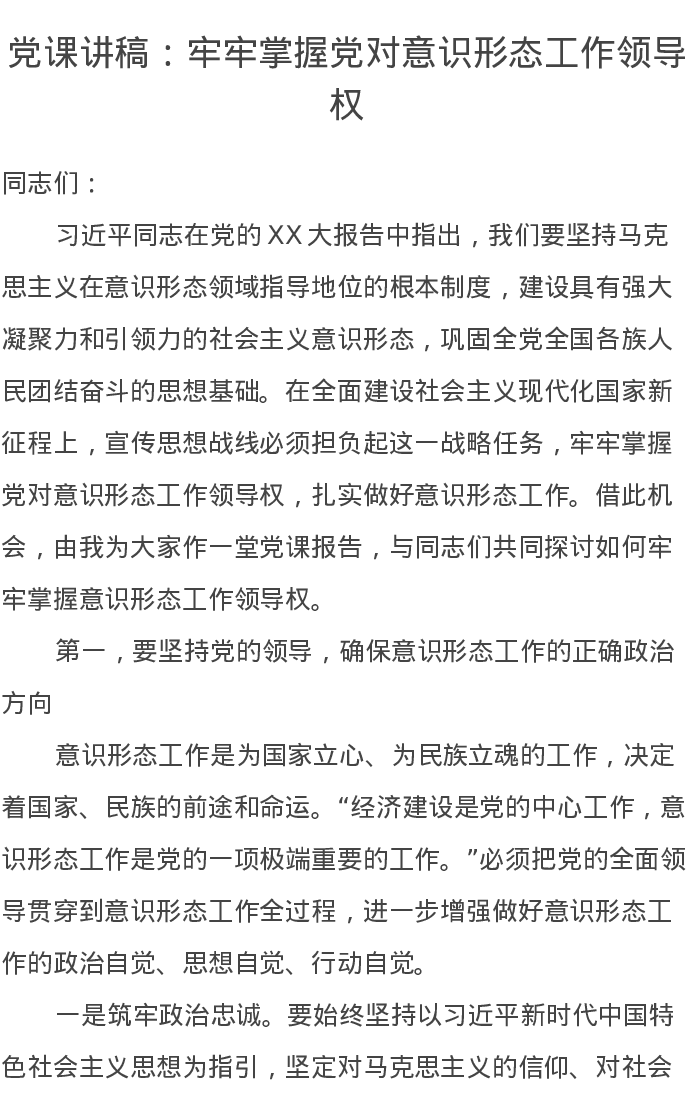 党课讲稿:牢牢掌握党对意识形态工作领导权