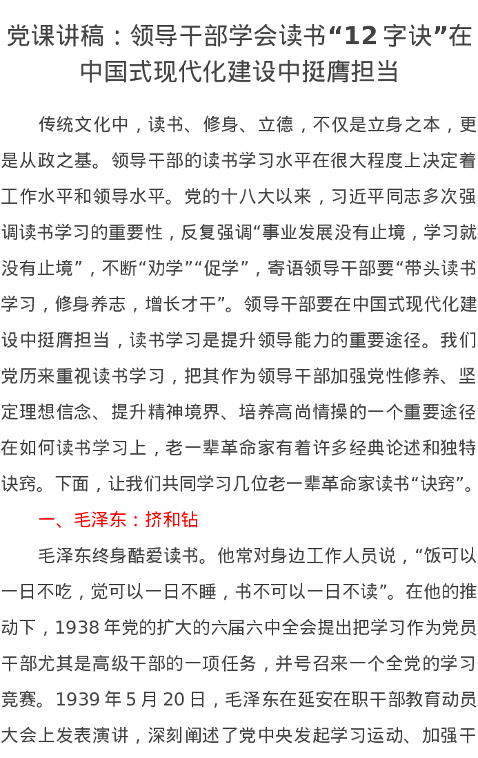 党课讲稿:领导干部学会读书“12字诀”在中国式现代化建设中挺膺担当