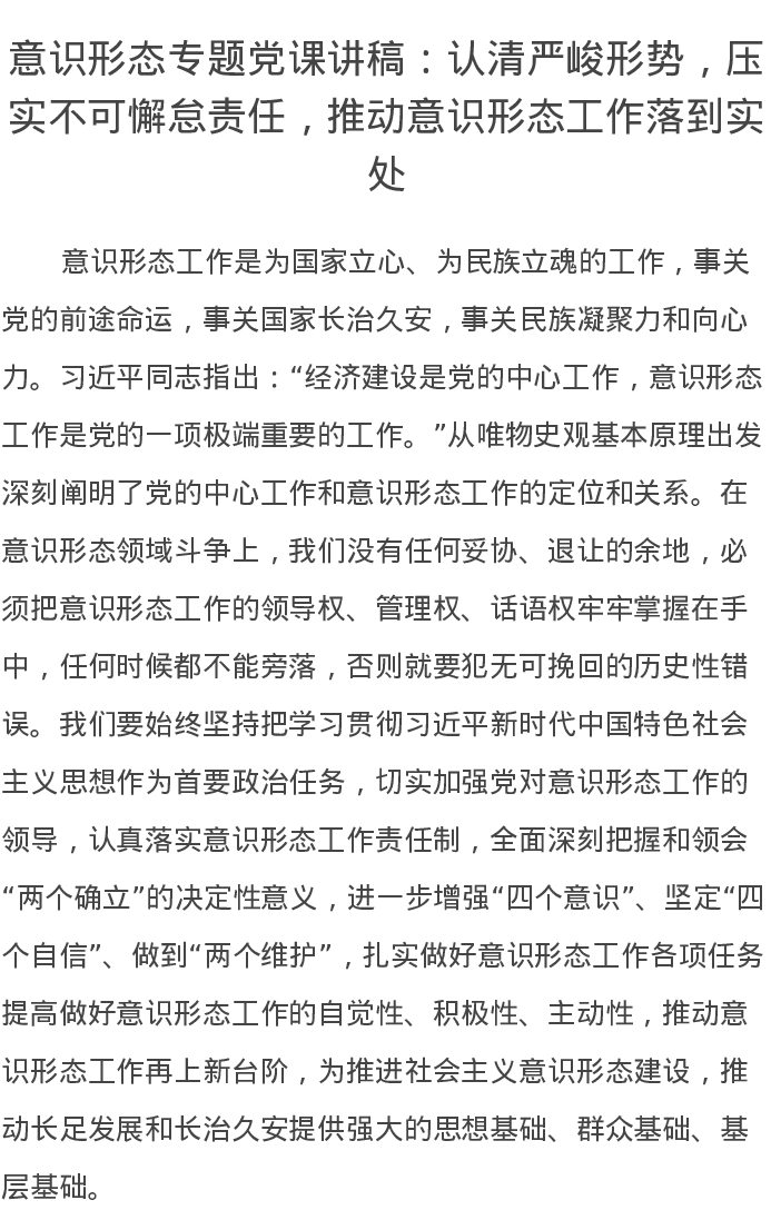 意识形态党课讲稿:认清严峻形势,压实不可懈怠责任,推动意识形态工作落到实处