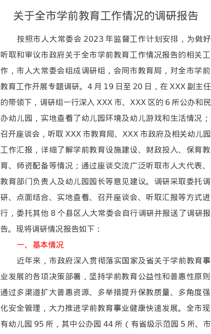 关于全市学前教育工作情况的调研报告