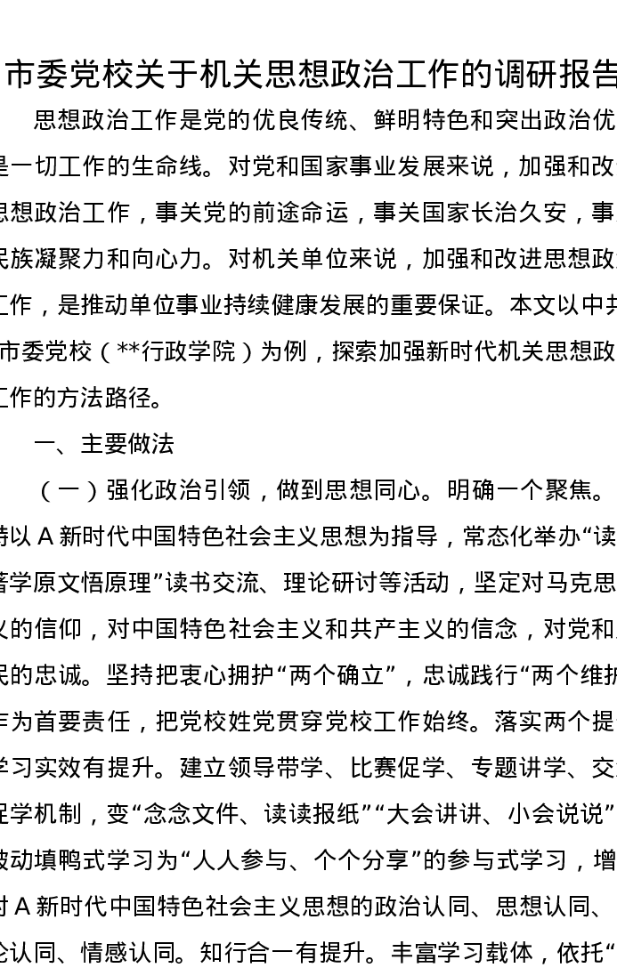 市委党校关于机关思想政治工作的调研报告