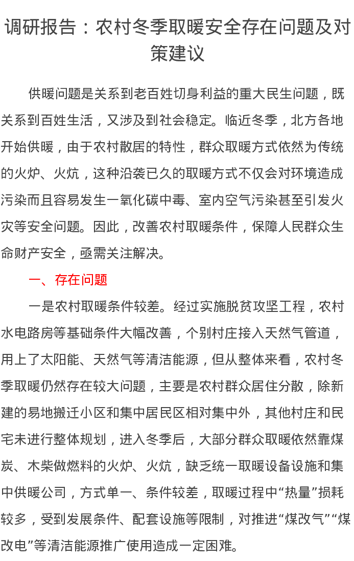 调研报告:农村冬季取暖安全存在问题及对策建议