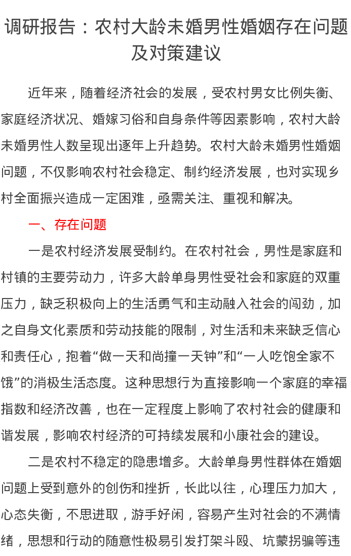 调研报告:农村大龄未婚男性婚姻存在问题及对策建议