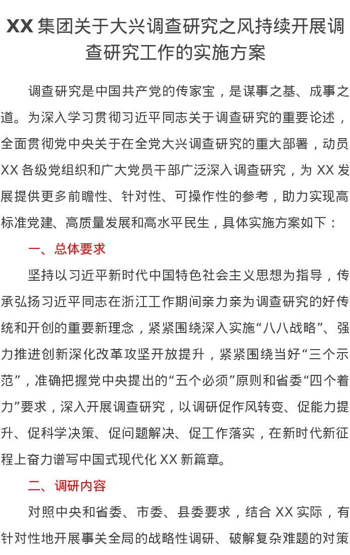 XX集团关于大兴调查研究之风持续开展调查研究工作的实施方案