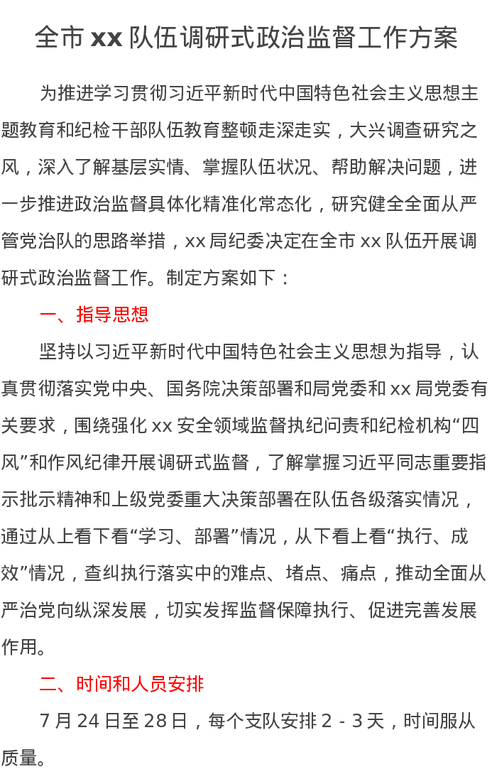 全市xx队伍调研式政治监督工作方案