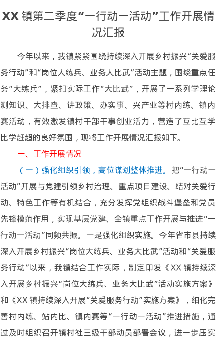 XX镇第二季度“一行动一活动”工作开展情况汇报
