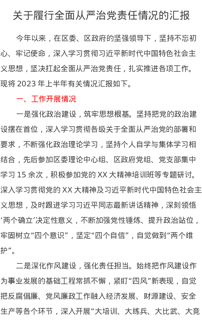 关于履行全面从严治党责任情况的汇报