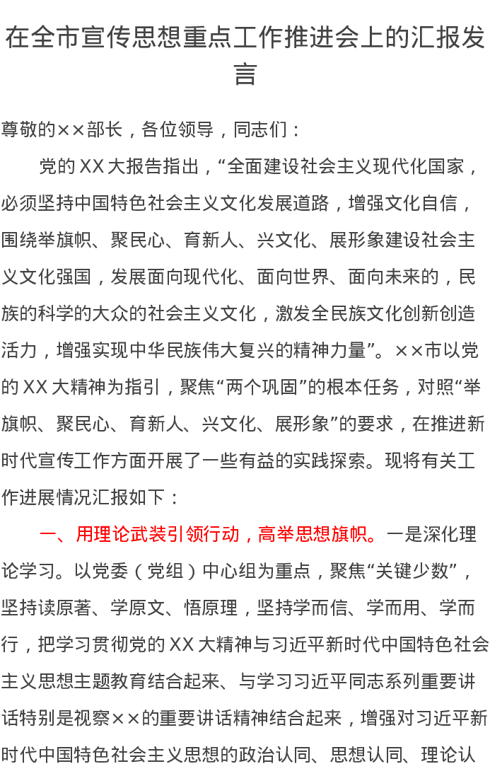 在全市宣传思想重点工作推进会上的汇报发言