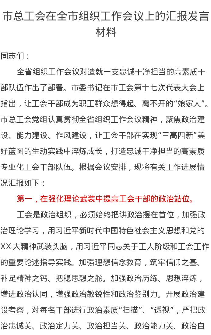 市总工会在全市组织工作会议上的汇报发言材料