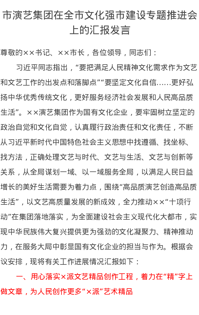 市演艺集团在全市文化强市建设专题推进会上的汇报发言