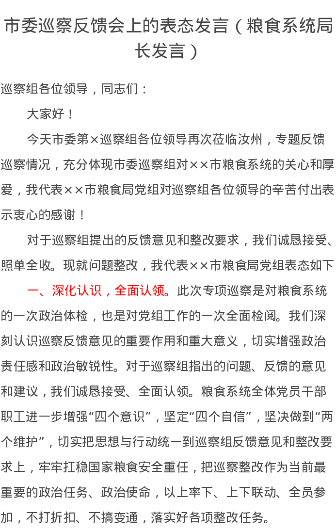 市委巡察反馈会上的表态发言(粮食系统局长发言)