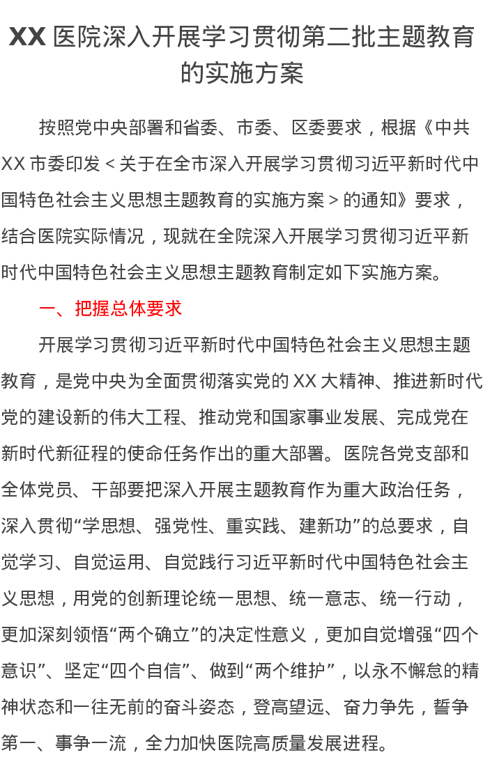 XX医院深入开展学习贯彻第二批主题教育的实施方案(特色社会主义思想)