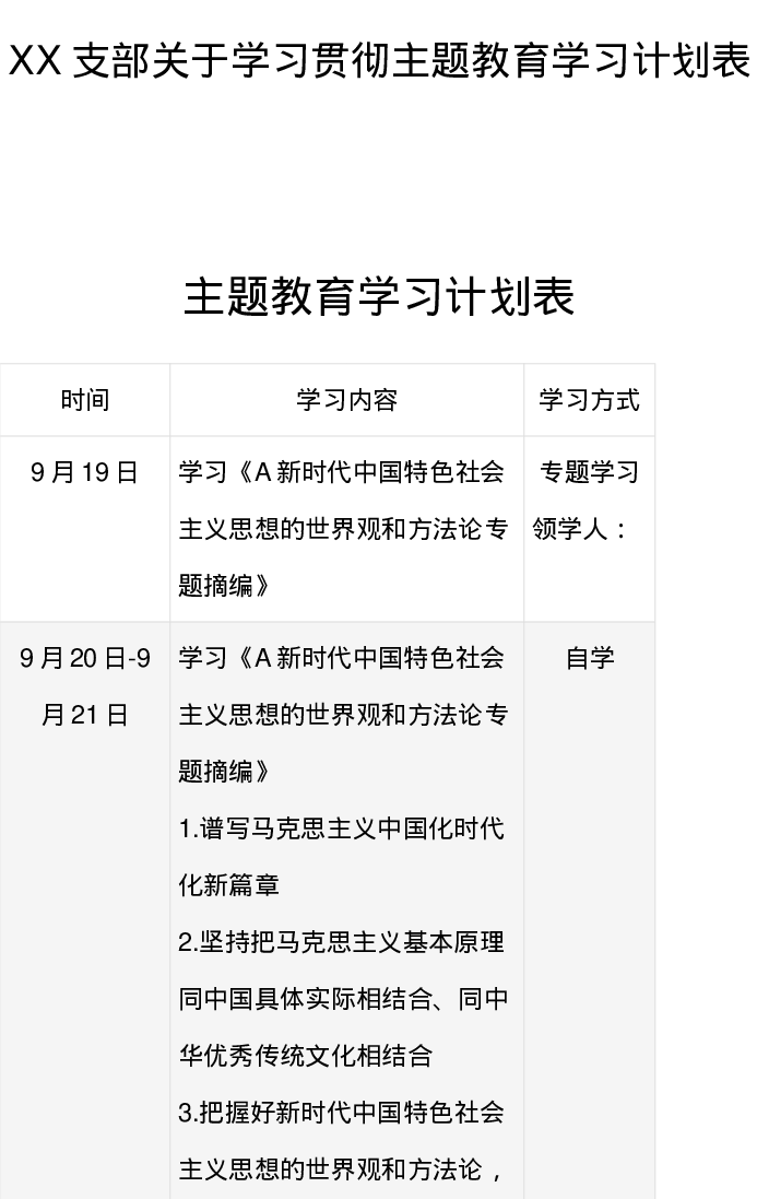 XX支部关于学习贯彻第二批主题教育学习计划表(特色社会主义思想)