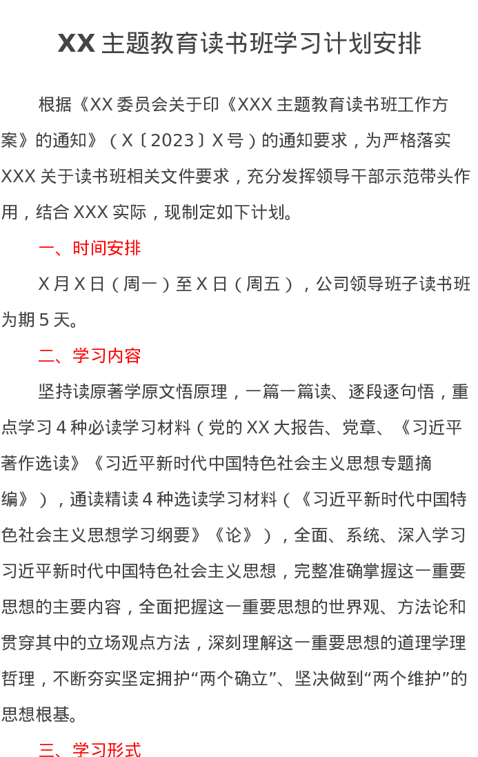 XX第二批主题教育读书班学习计划安排(特色社会主义思想)