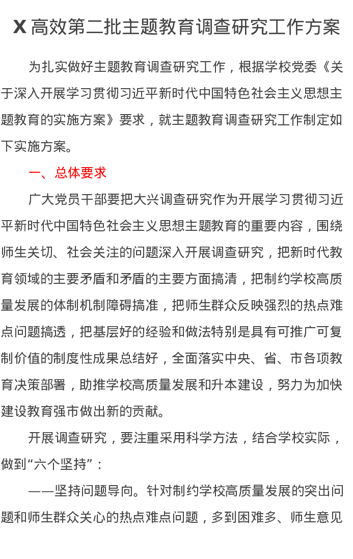 X高校第二批主题教育调查研究工作方案(特色社会主义思想)
