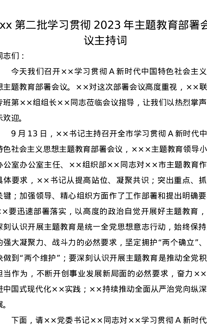 xx第二批学习贯彻2023年主题教育部署会议主持词(特色社会主义思想)