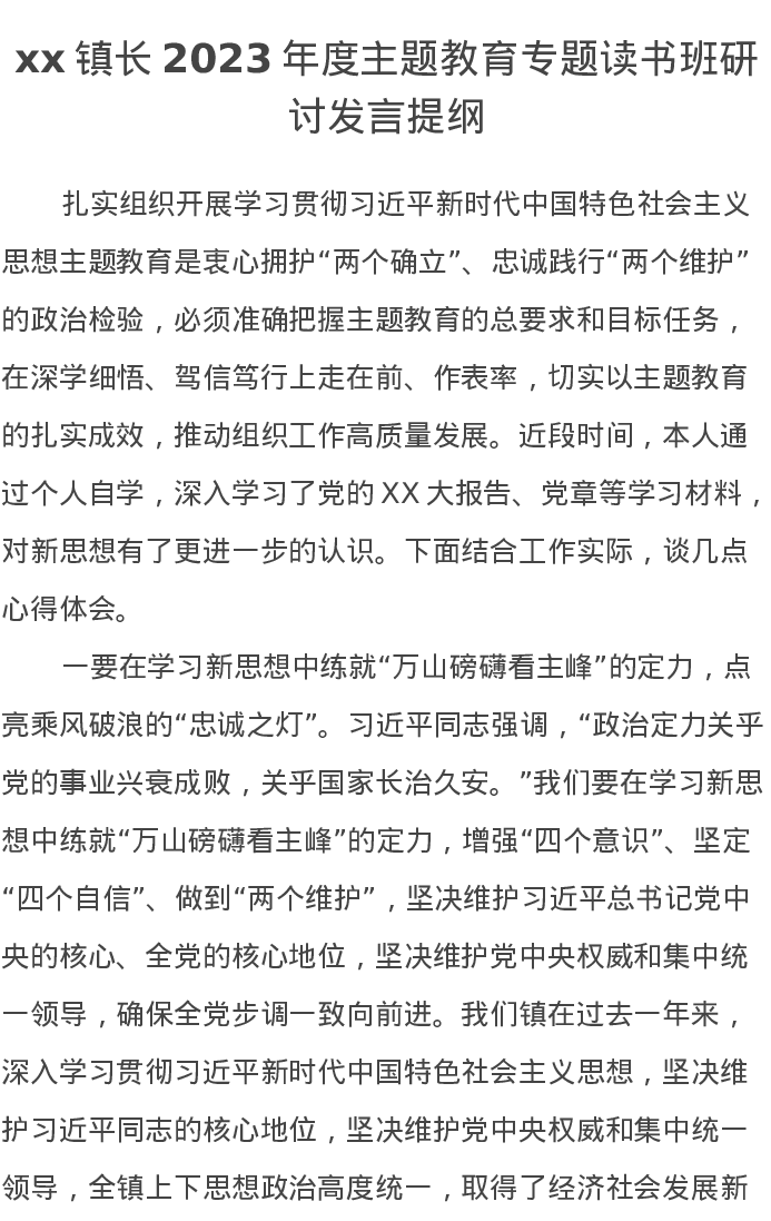 xx镇长2023年度第二批主题教育专题读书班研讨发言提纲(特色社会主义思想)