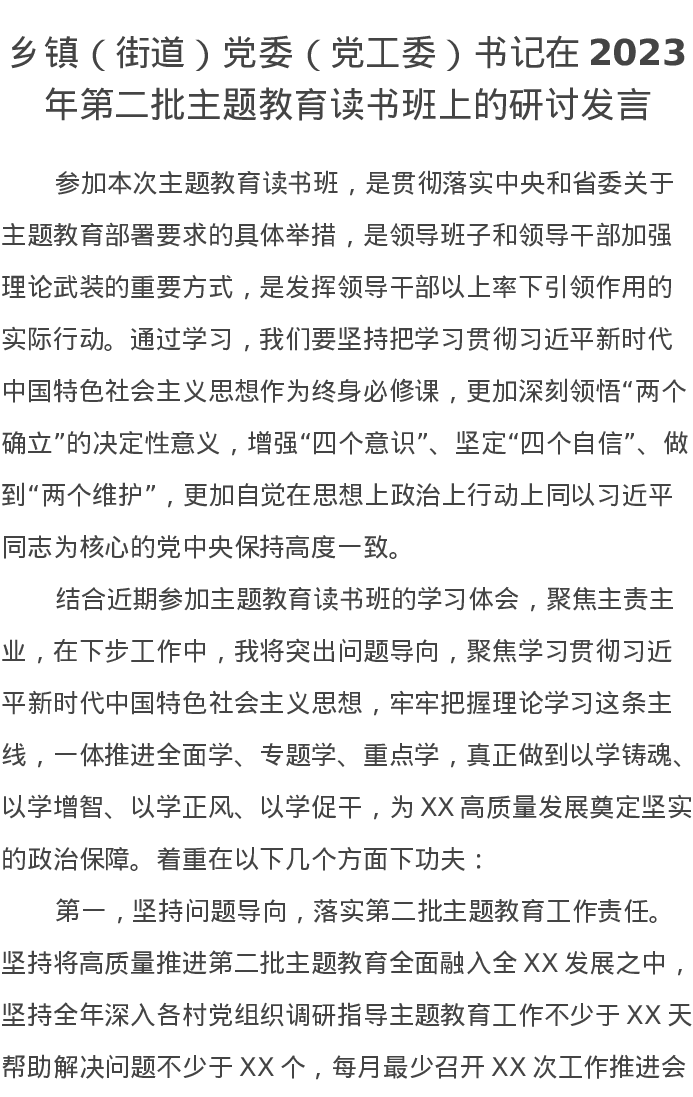 乡镇(街道)党委(党工委)书记在2023年第二批主题教育读书班上的研讨发言(特色社会主义思想)