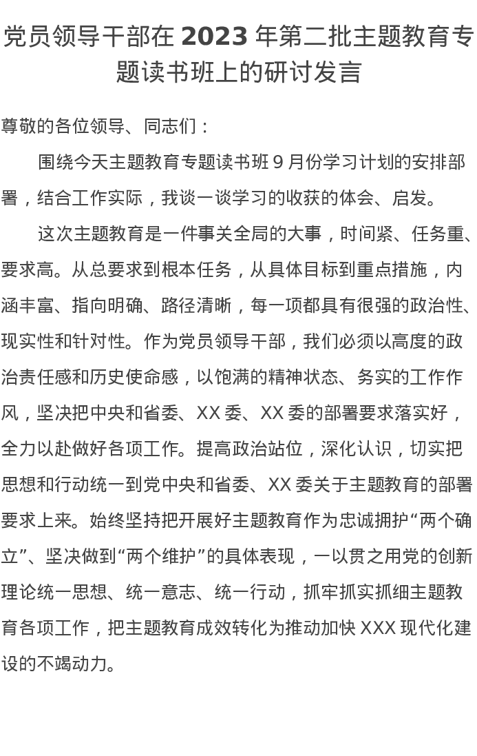 党员领导干部在2023年第二批主题教育专题读书班上的研讨发言(特色社会主义思想)