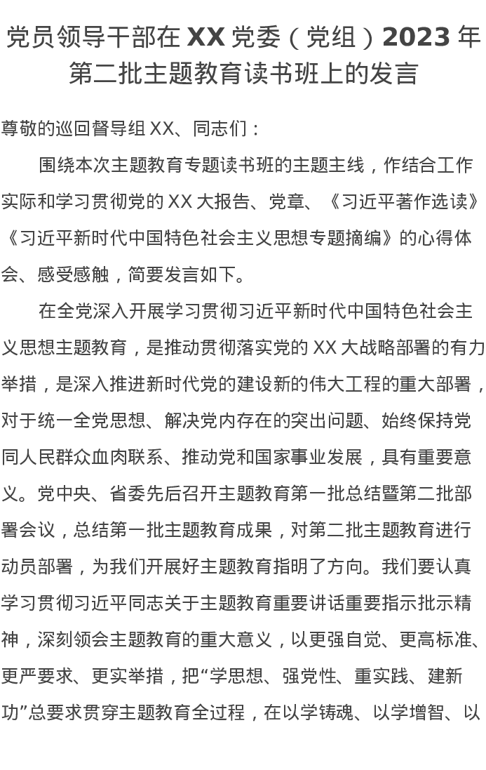 党员领导干部在XX党委(党组)2023年第二批主题教育读书班上的发言(特色社会主义思想)