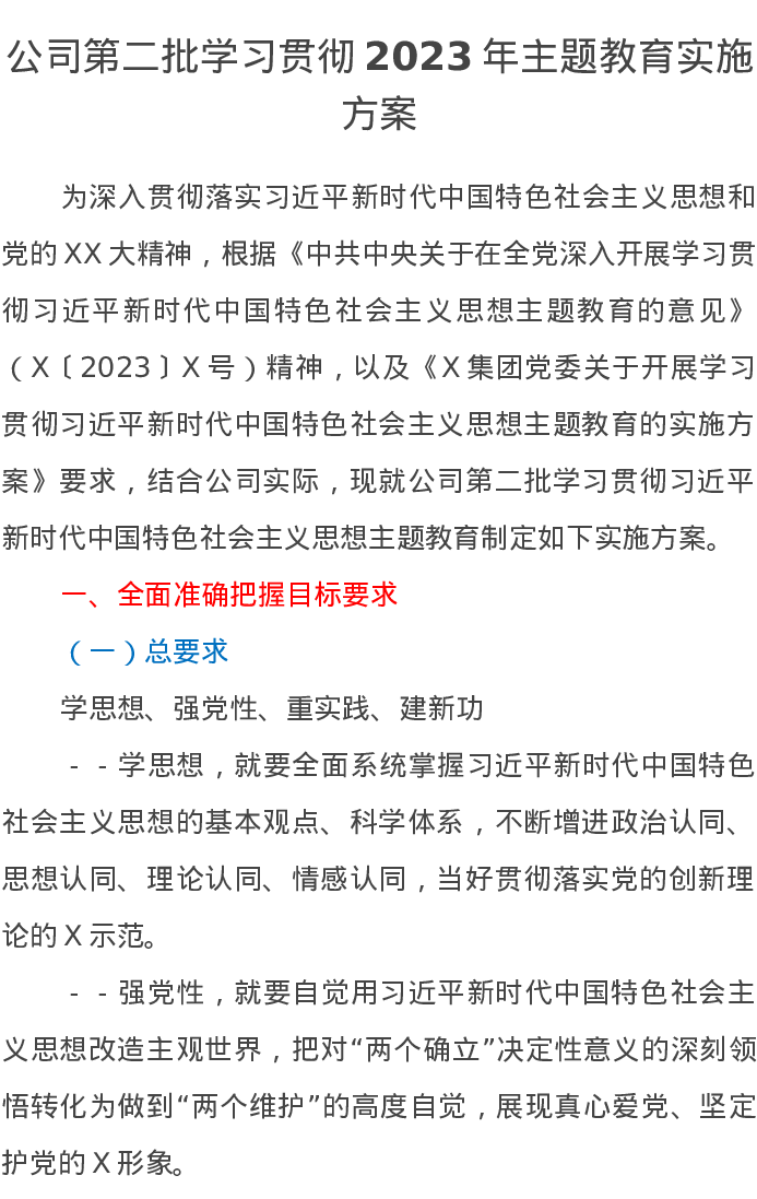 公司第二批学习贯彻2023年主题教育实施方案(特色社会主义思想)