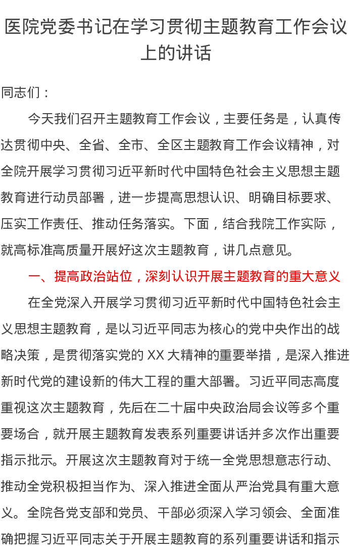 医院党委书记在学习贯彻第二批主题教育工作会议上的讲话(特色社会主义思想)