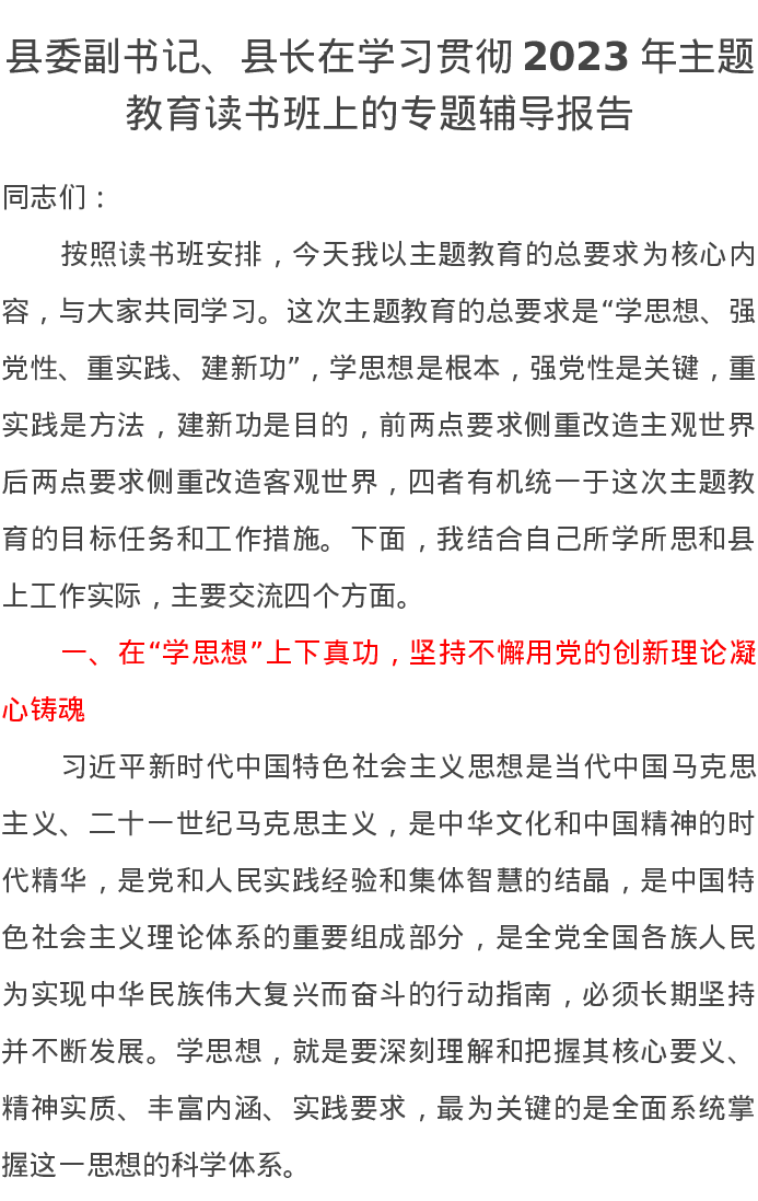 县委副书记、县长在学习贯彻2023年第二批主题教育读书班上的专题辅导报告(特色社会主义思想)
