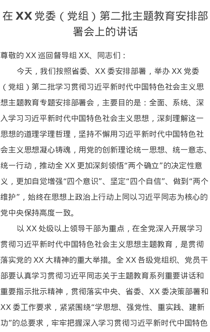在XX党委(党组)第二批主题教育安排部署会上的讲话(特色社会主义思想)