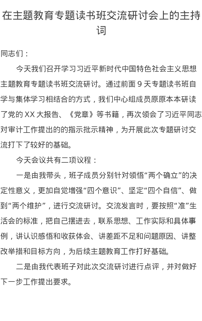 在第二批主题教育专题读书班交流研讨会上的主持词(特色社会主义思想)