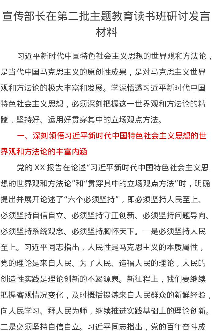 宣传部长在第二批主题教育读书班研讨发言材料(特色社会主义思想)