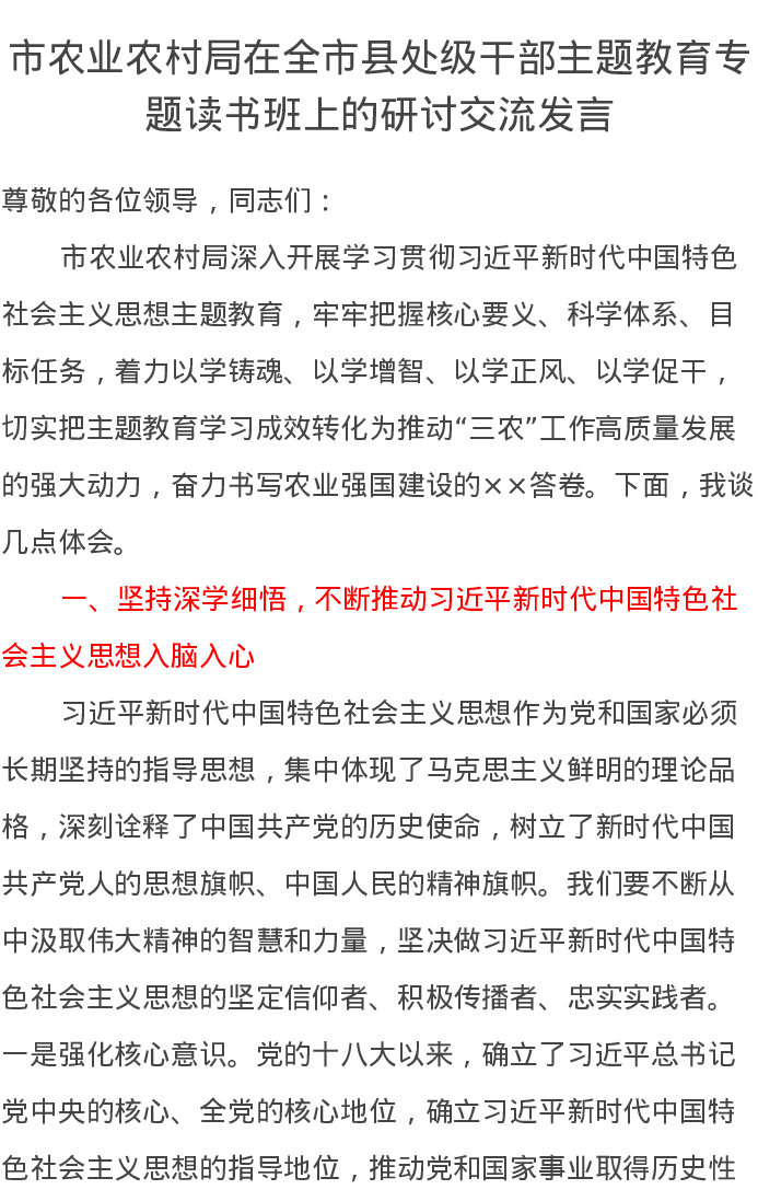 市农业农村局在全市县处级干部第二批主题教育专题读书班上的研讨交流发言(特色社会主义思想)