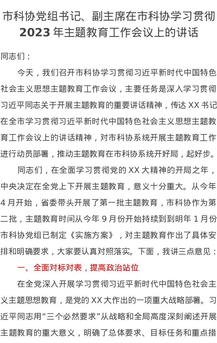市科协党组书记、副主席在市科协学习贯彻2023年第二批主题教育工作会议上的讲话(特色社会主义思想)