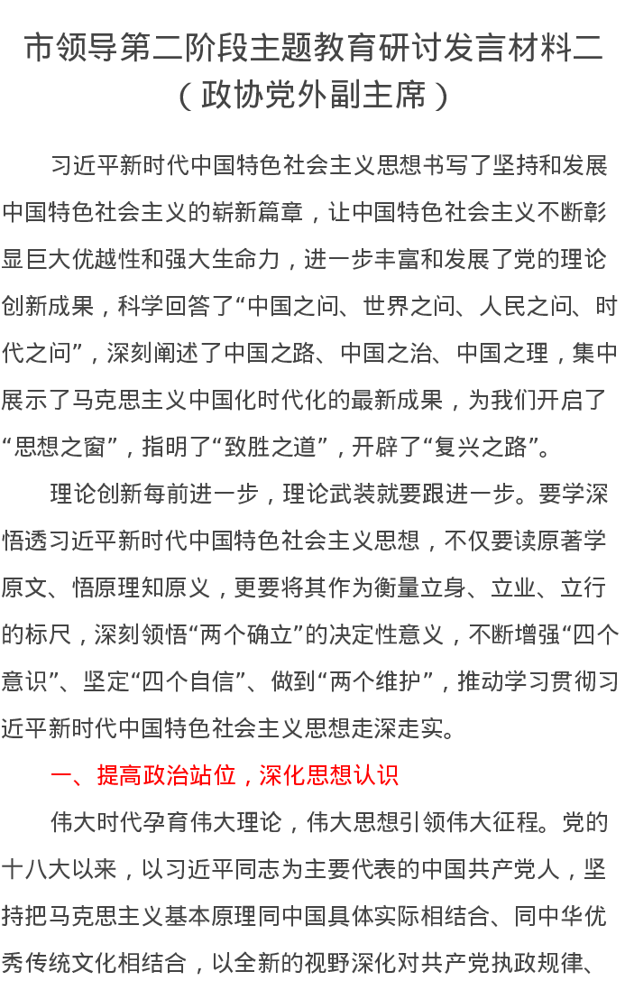 市领导第二批第二阶段主题教育研讨发言材料二(政协党外副主席)