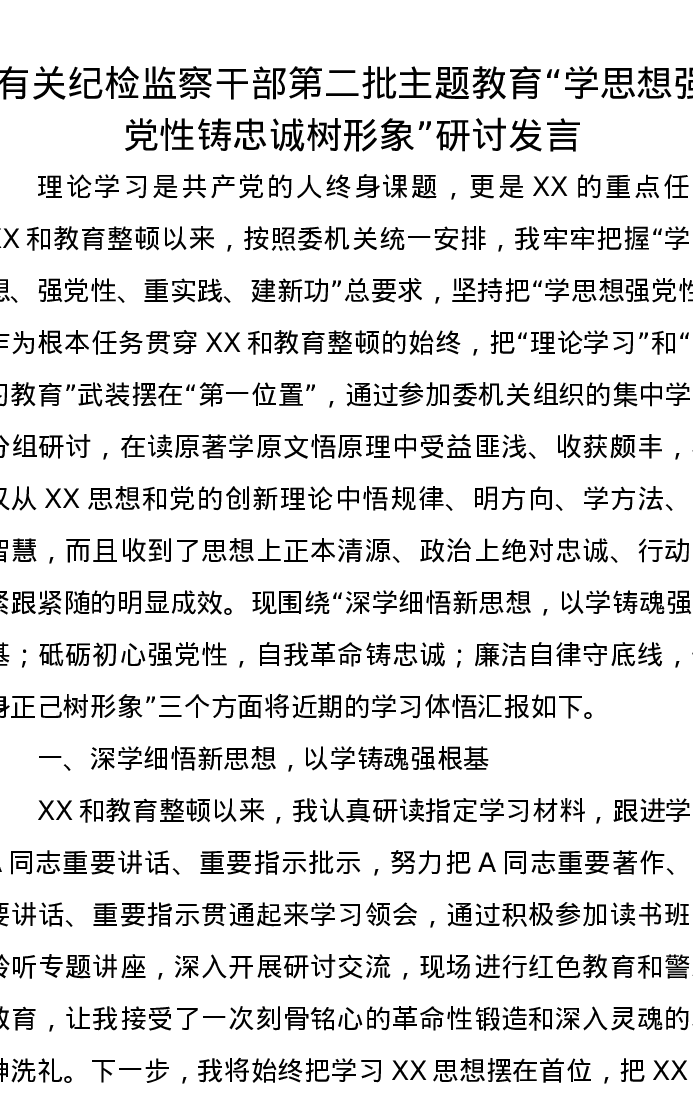 有关纪检监察干部第二批主题教育“学思想强党性铸忠诚树形象”研讨发言(特色社会主义思想)