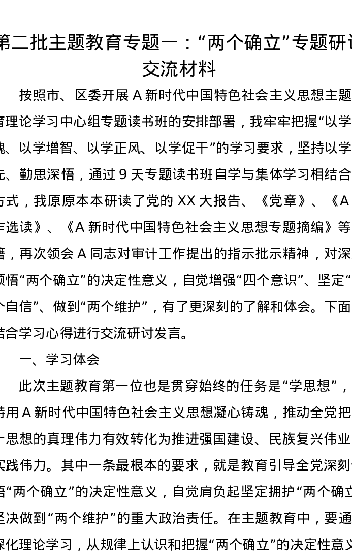 第二批主题教育专题一:“两个确立”专题研讨交流发言材料(特色社会主义思想)