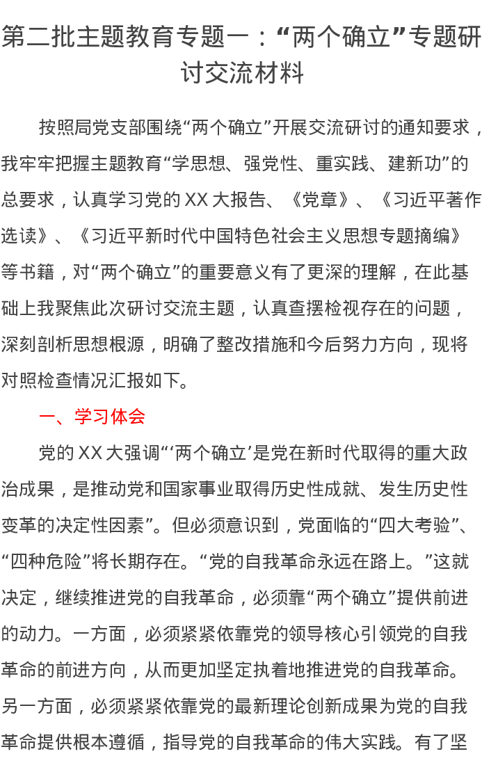 第二批主题教育专题一:“两个确立”专题研讨交流材料(特色社会主义思想)