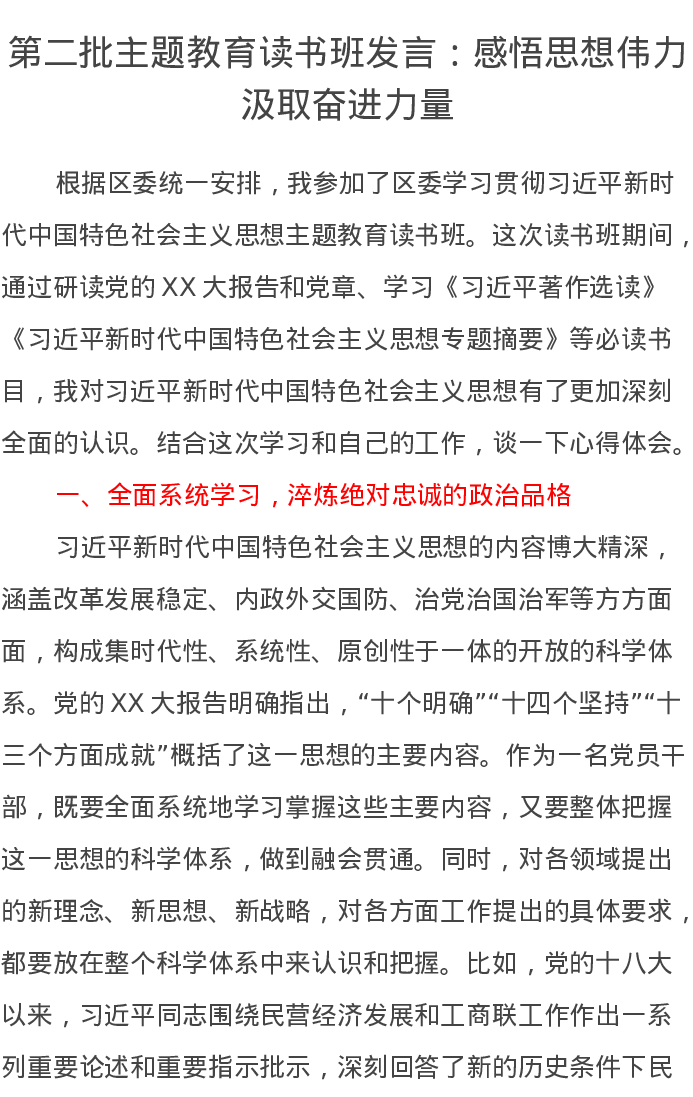 第二批主题教育读书班发言:感悟思想伟力汲取奋进力量(特色社会主义思想)