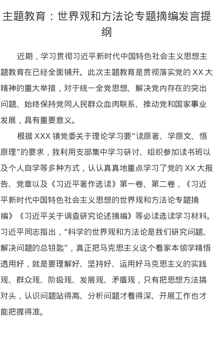 第二批主题教育:世界观和方法论专题摘编发言提纲(特色社会主义思想)