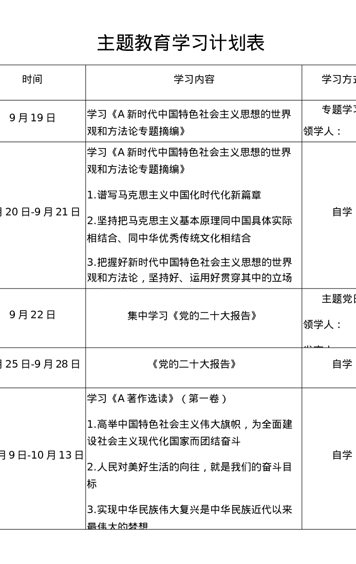 第二批支部主题教育学习计划表(特色社会主义思想)