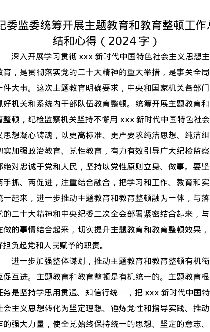 纪委监委统筹开展第二批主题教育和教育整顿工作总结和心得(特色社会主义思想)