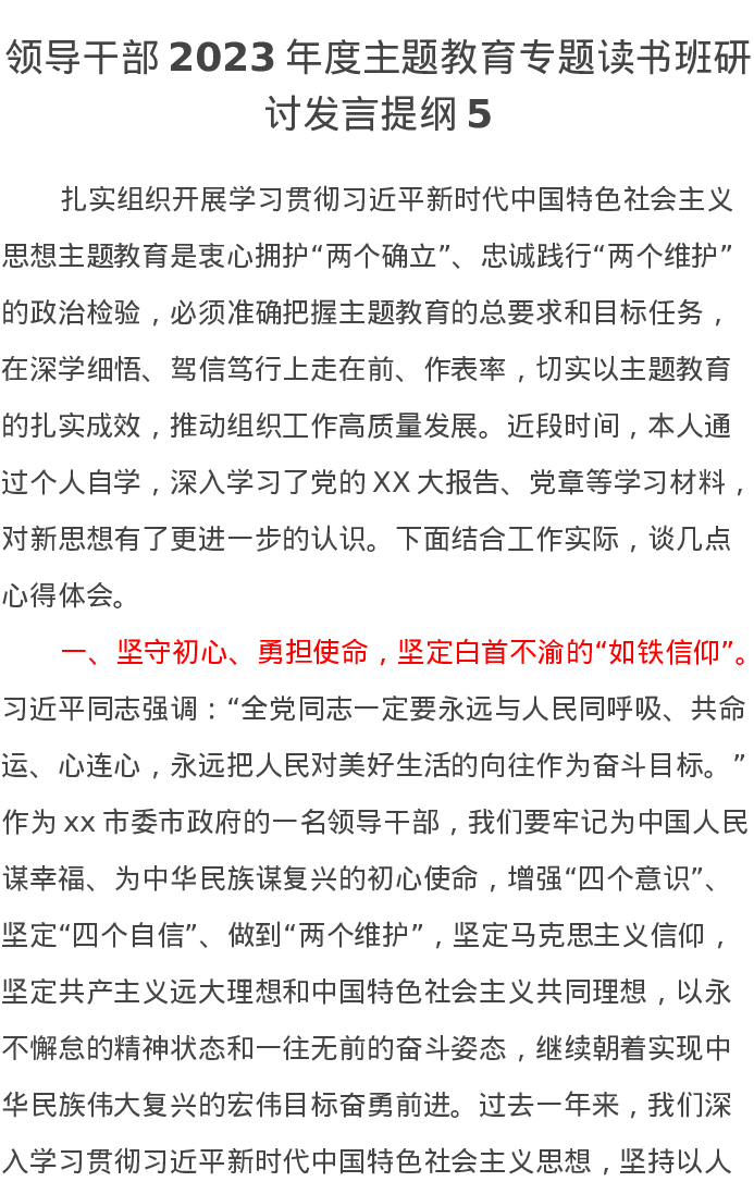 领导干部2023年度第二批主题教育专题读书班研讨发言提纲5(特色社会主义思想)