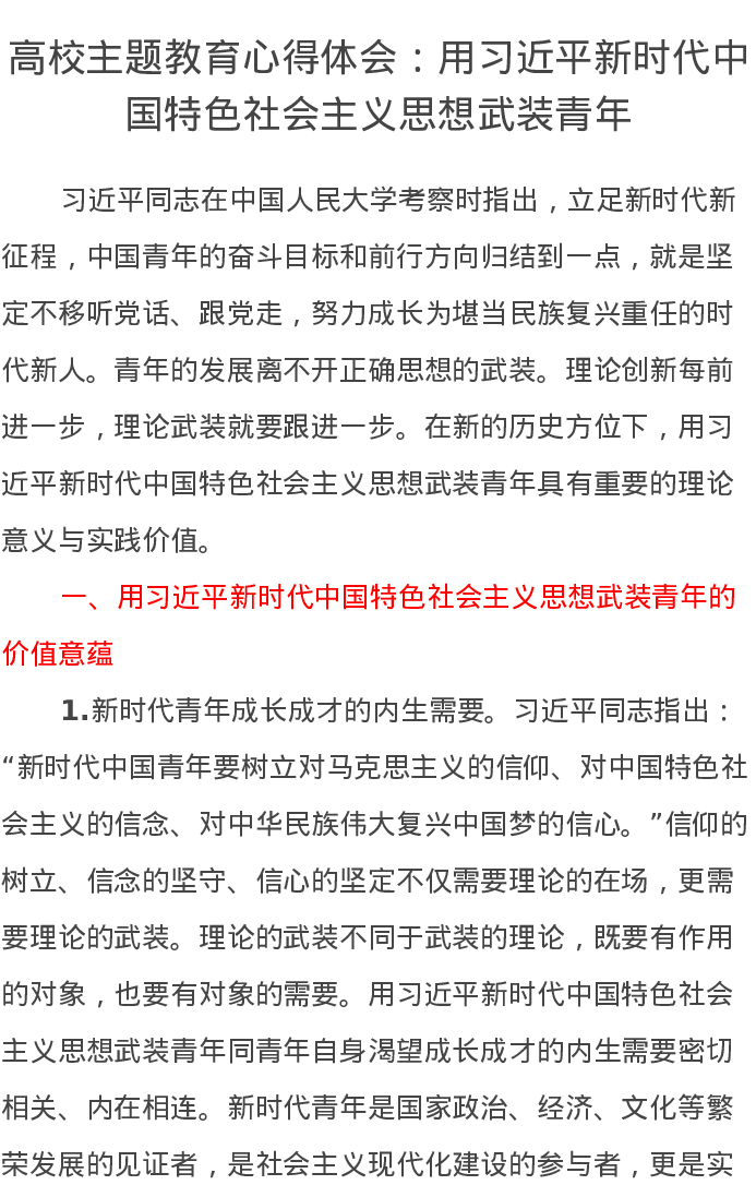 高校主题教育心得体会:用习近平新时代中国特色社会主义思想武装青年