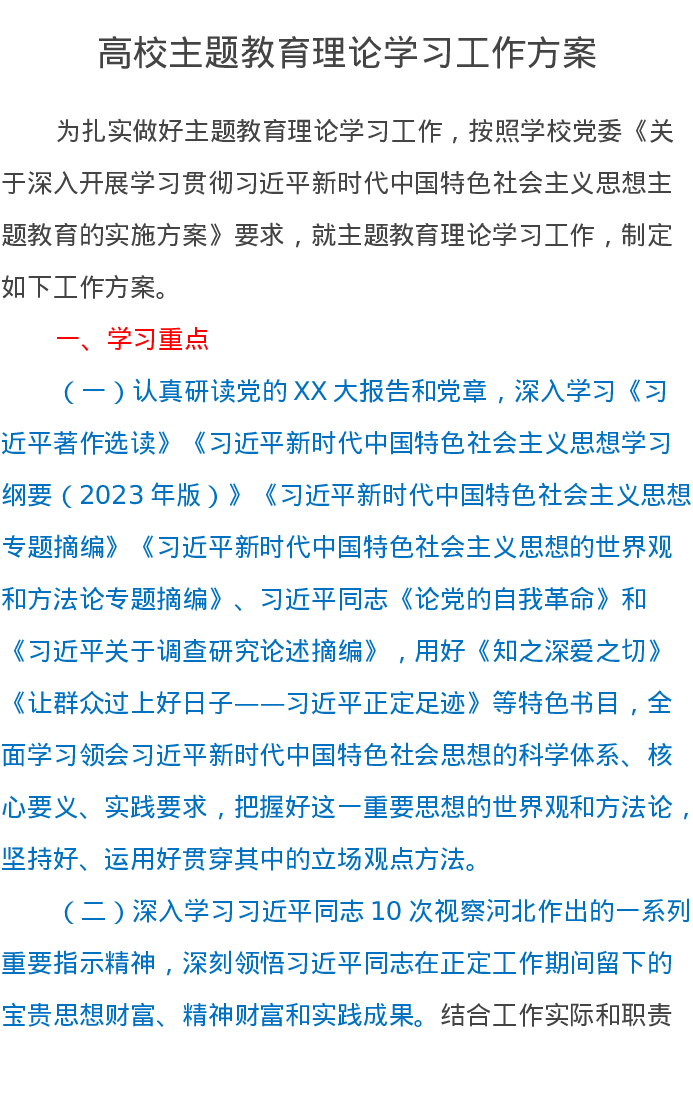 高校第二批主题教育理论学习工作方案(特色社会主义思想)