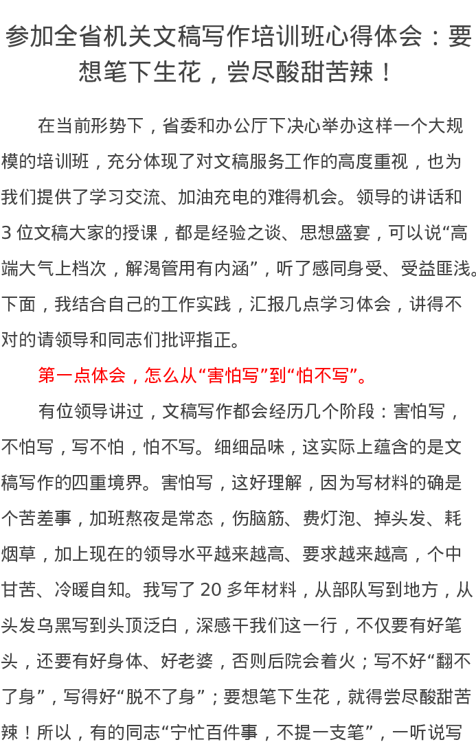 参加全省机关文稿写作培训班心得体会:要想笔下生花,尝尽酸甜苦辣!