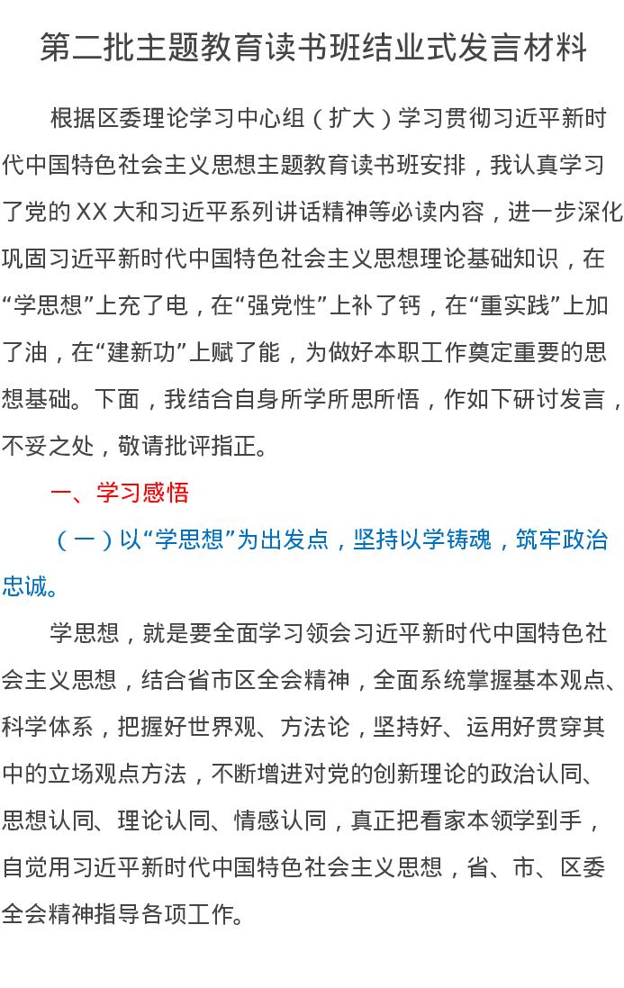 第二批主题教育读书班结业式发言材料(特色社会主义思想)