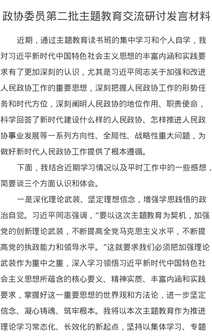 政协委员第二批主题教育交流研讨发言材料(特色社会主义思想)