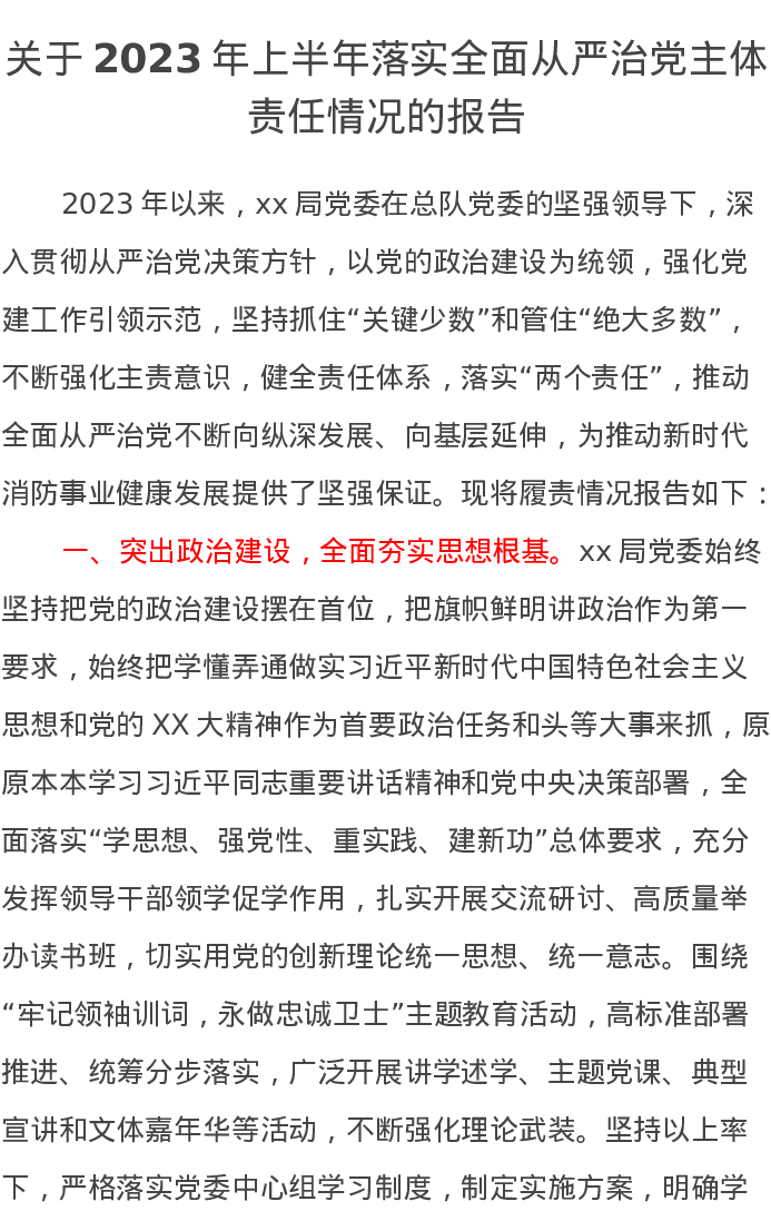 关于2023年上半年落实全面从严治党主体责任情况的报告