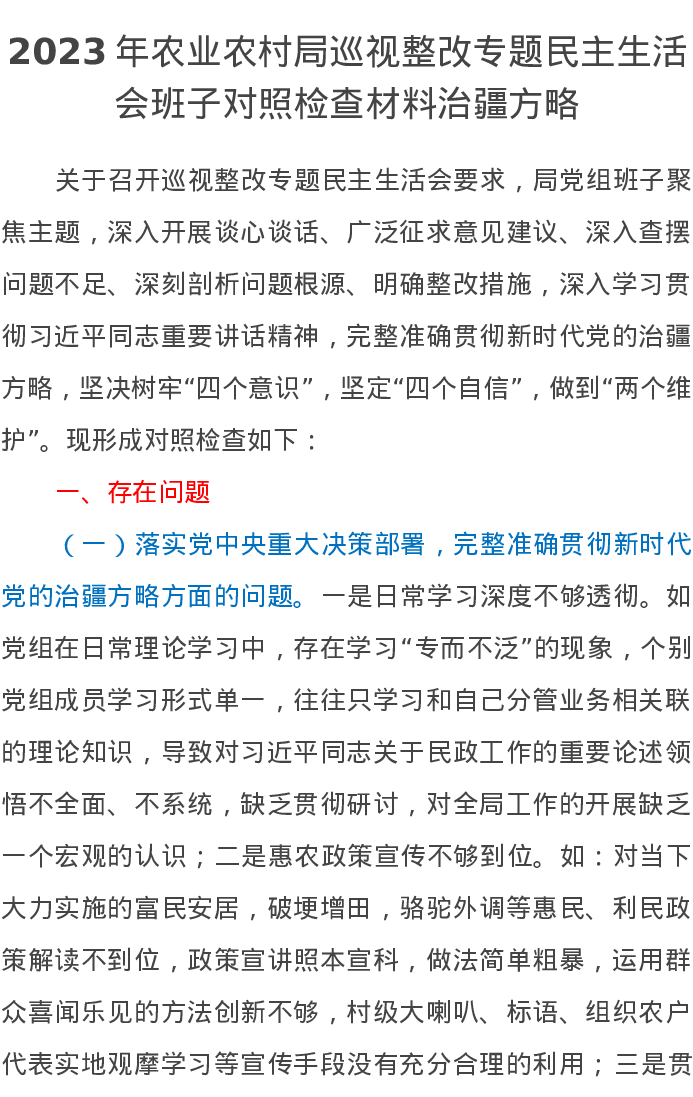 2023年农业农村局巡视整改专题民主生活会班子对照检查材料(治疆方略)